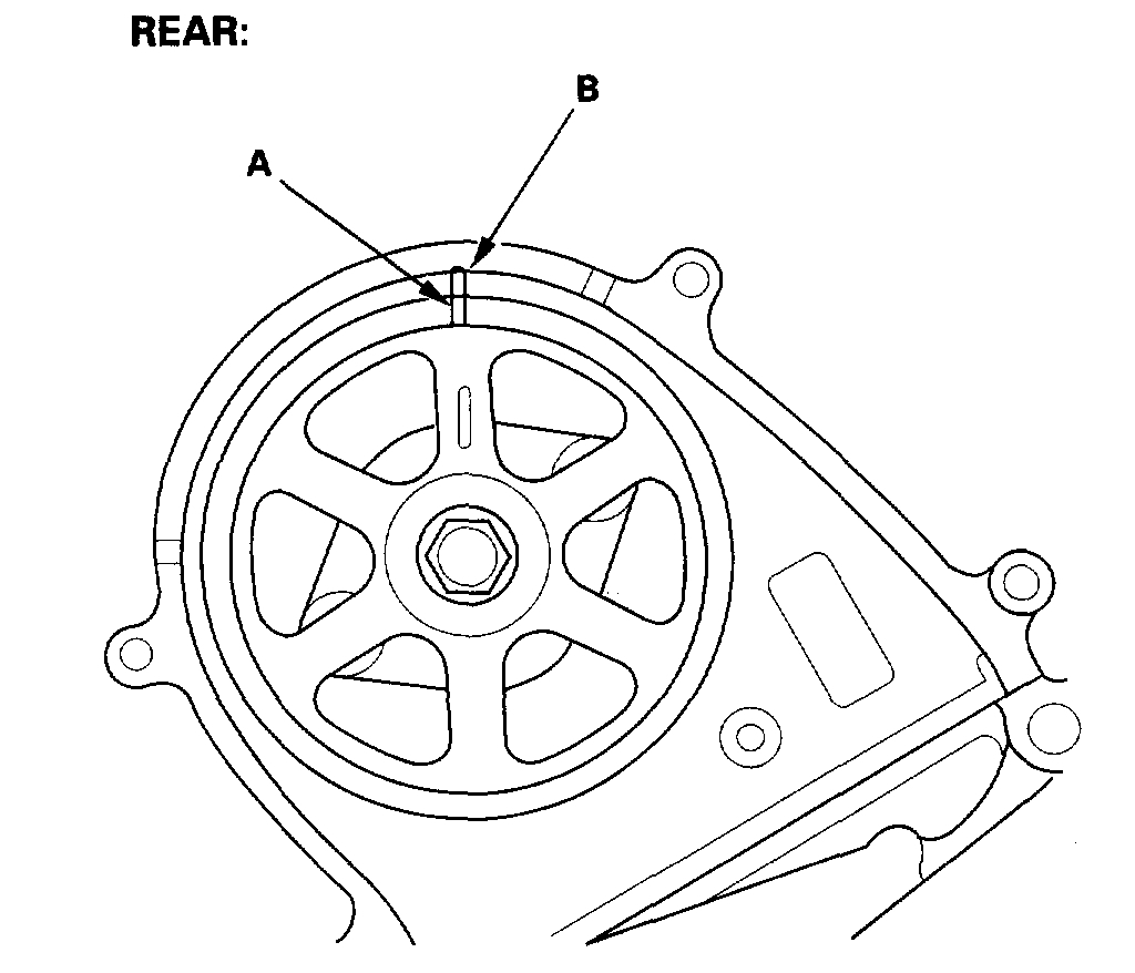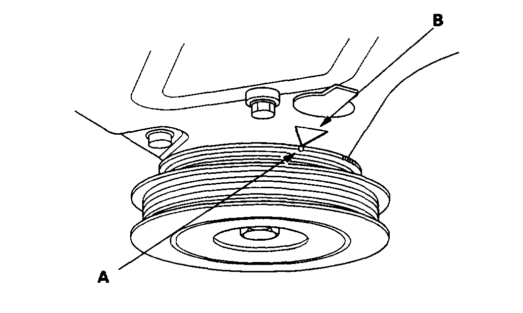 13. Turn the crankshaft pulley so its white mark (A) lines up with the pointer (B).