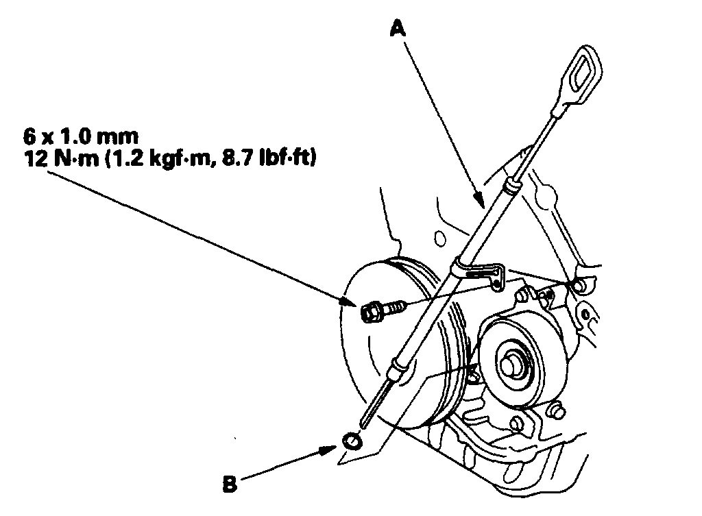 15. Install the dipstick and tube (A) with a new O-ring (B).
