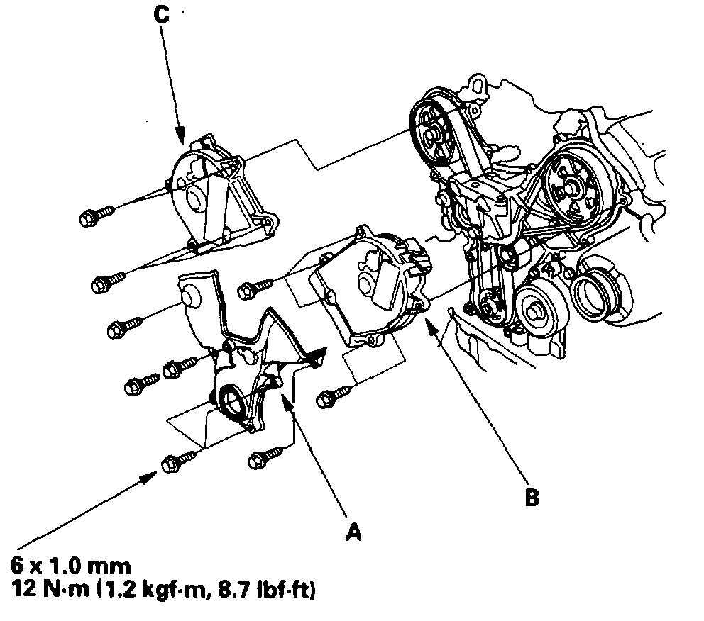 14. Clean all oil off the inside face (A) of the crankshaft pulley, and apply lubricant to the pulley bolt (B) and washer (C).