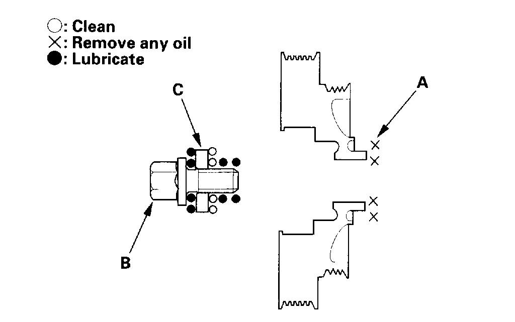 10. Clean any oil off the inside face (A) of the crankshaft pulley, and apply lubricant to the pulley bolt (B) and washer (C).