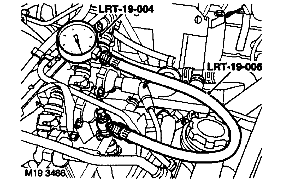 2. Disconnect pressure gauge LRT-19-006 and adapter LRT-19-004 from fuel rail.