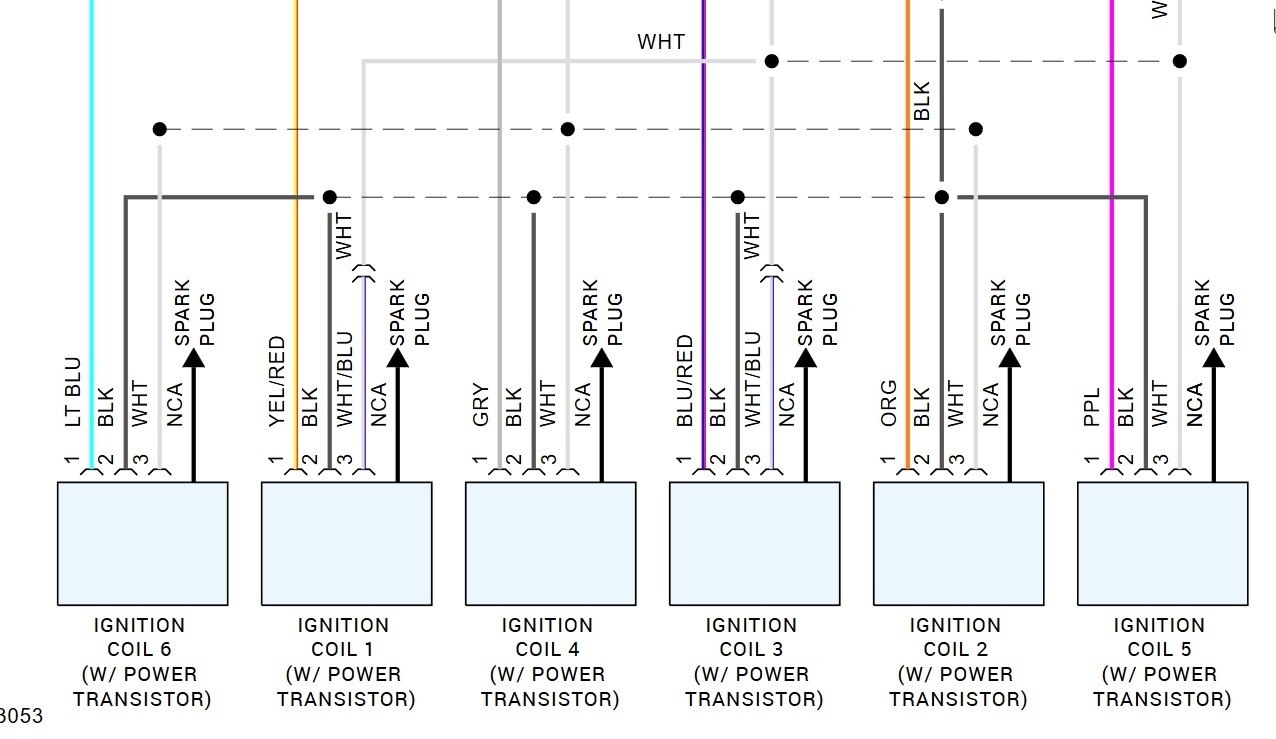 These are the colors for the coils. The only wire that you need to pay attention to is the colored wire on pin one. The Black wire is ground for all of them, the White (some have a stripe as well) is the power to each coil. The colored wires are the coil triggers, So for cylinder 1 you want the plug with the Yellow with red wire, 2 is Orange, 3 is Blue with red, 4 is Gray, 5 is Purple and 6 is Light Blue.
