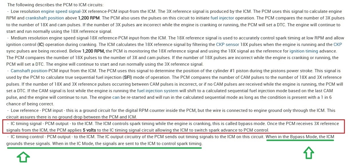 I know this system is confusing because the cam and crank signals are not directly fed to the PCM, they come through the ICM first. The Low Reference wire is stated as "providing a Ground circuit for the digital RPM counter inside the PCM. But the wire is connected to the engine ground only through the ICM. This assures there is no ground drop between the PCM and ICM". Those are the exact words from service info.