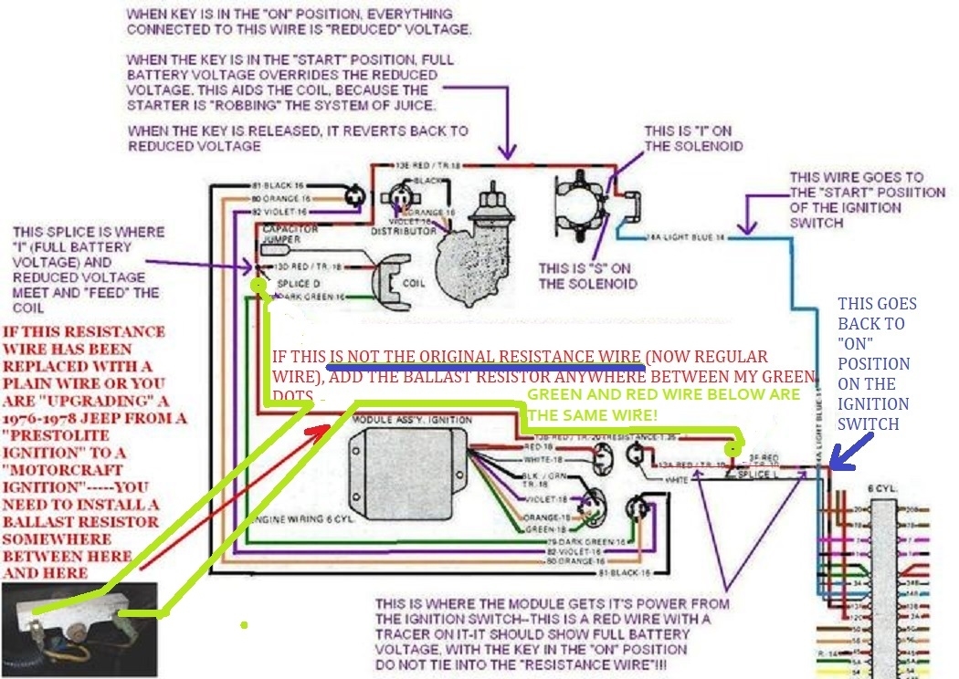 In a nutshell, wiring one of those later Jeep's ignition wiring to be hooked up like the '79 diagram I'm showing you is the Nutter! (They have a resistance wire- no need for the ballast resistor)