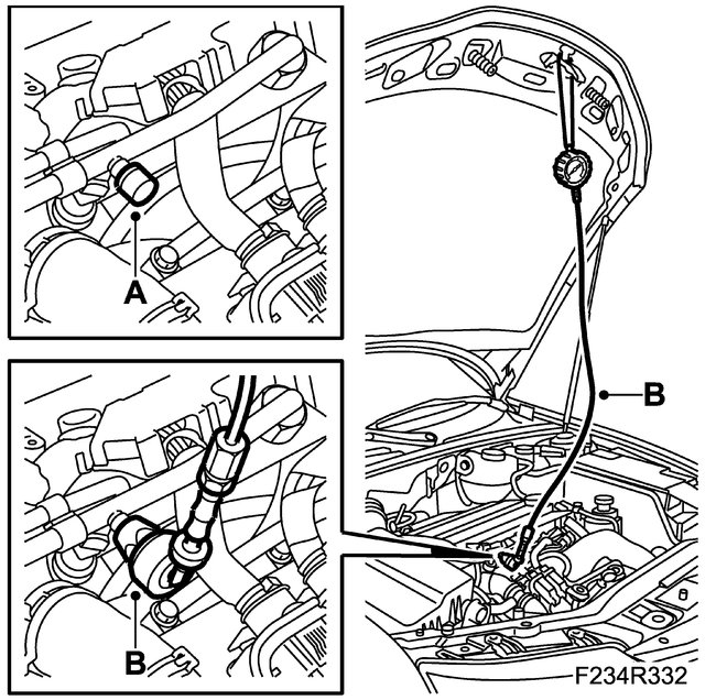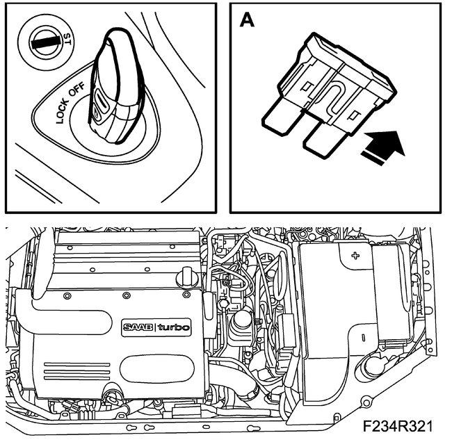 1. Reduce the oil pressure by removing fuse 2 for the fuel pump while the engine is running (fuse 2 is located in the main fuse box in front of the battery). Once the engine has stopped, turn the ignition key to LOCK and refit the fuse (A).