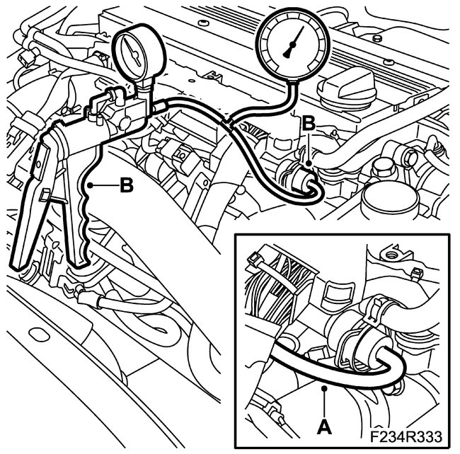 2. Detach the vacuum hose from the pressure regulator (A) and connect pressure/vacuum pump (B), 30 14 883 Pressure/vacuum pump, and charge pressure meter (B), 83 93 514 Charge pressure meter.