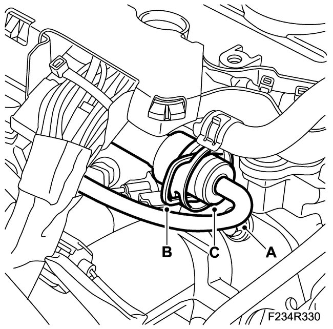 5. Remove the fuel pressure regulator (C). Collect any fuel spill with a rag.
