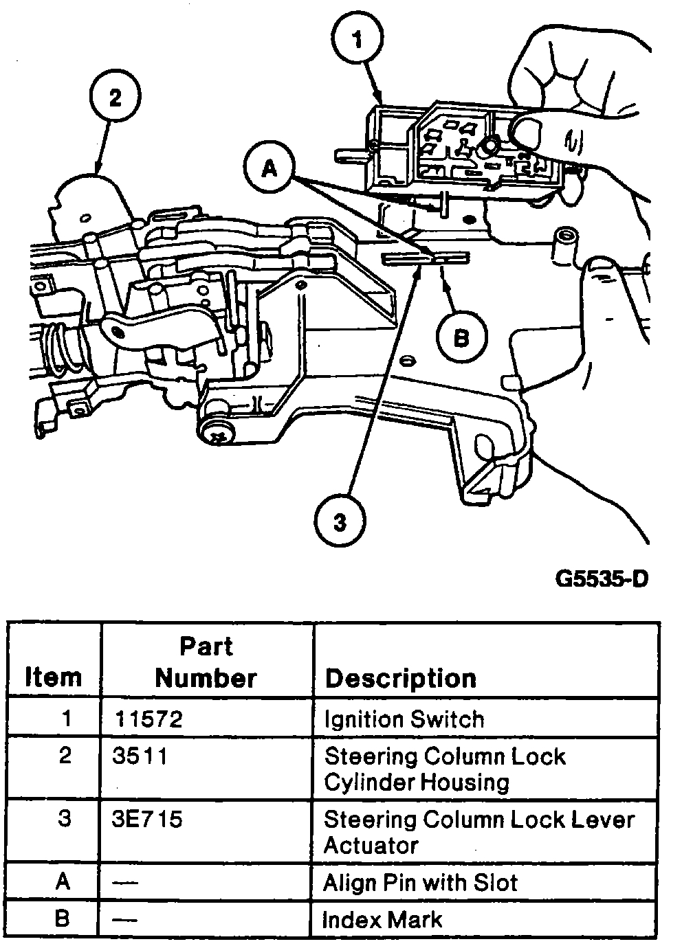 3. Install the ignition switch into the column actuator hole. It may be necessary to move the ignition switch slightly back and forth to align the ignition switch mounting holes with the lock cylinder housing threaded holes.