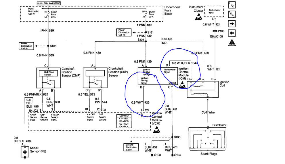 No security light is on, no codes. One thing I'd like to know on my coil I have a plug in that had 3 terminals one is pink wire which is my 12 volts, the other one in middle is the white wire for the tech, the 3rd circuit is the Whittemore and black stripe wire that the ICM sends its signal to coil to make it fire. Okay on all three circuit I have 120 volts coming in on pink wire I have 12 volts coming out on the tech wire, a different 12 volts coming out of the white/black strip down it which is my signal wire from ICM. How can you push 12 volts to a 5 volt circuit? When I turn key on the coil would be sending 12 volts to the ICM 5 volt circuit on signal wire. How is that? Is there someone out there that think so they can tell me a trick of why it won't produce a signal to coil to fire? I've asked and asked who can be smarter than anyone else out of 1,000 so of people.
