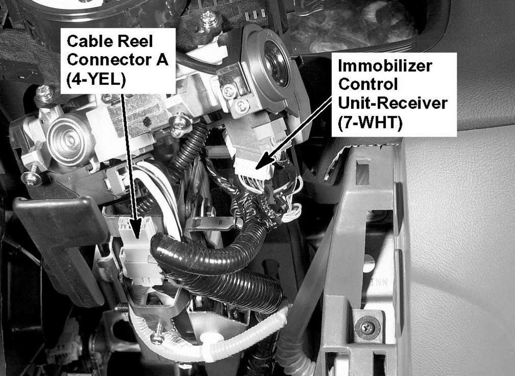 Because the light is working we know it isn't the fuse that powers the system that is the issue, the next most likely item is the immobilizer module itself. On that car replacement isn't real difficult as you remove the lower dash cover, then the steering column covers and finally remove the screws that hold the module in place and then the electrical connector. Then you reverse the process to put it back together. The nice thing about this system is that the key information is stored in the ECM so most of the time you don't need to reprogram in the keys as the replaced part only reads the key information and sends it to the ECM.