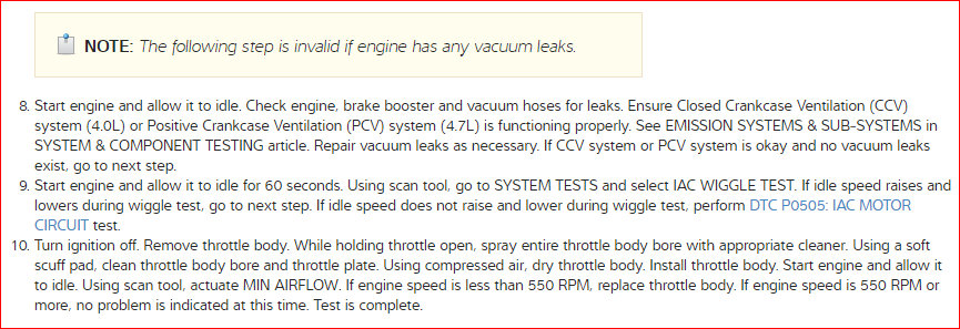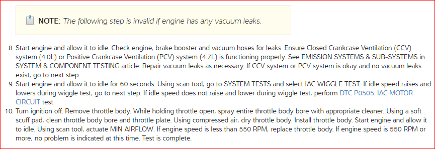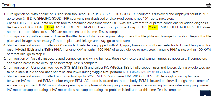 I have owned this vehicle for about eighteen months and no mechanic has been able to figure out this idle problem. It usually runs high, about 1,000 rpm's in gear and up to 1,400 in park. Sometimes it idles beautifully at 750-800 in gear and occasionally gets as low as 400 but does not shut off. So far I have had the vacuum lines smoked twice (two leaks found first time); replaced the spark plugs, TPS, IAC (twice), PCV, throttle body gasket and computer; and cleaned throttle body. Nothing has worked! The only code I get when the CEL is on is P1294, which is not exactly specific. Any other ideas me or my mechanic can follow up on?