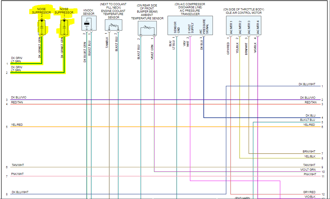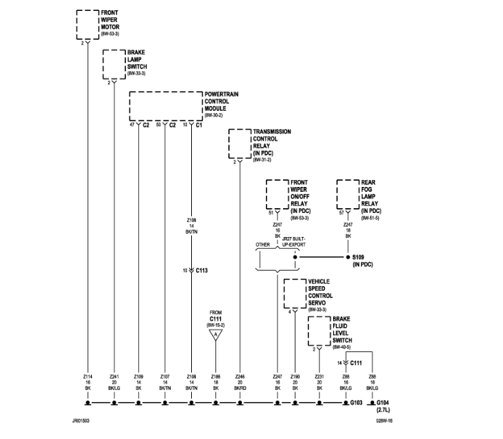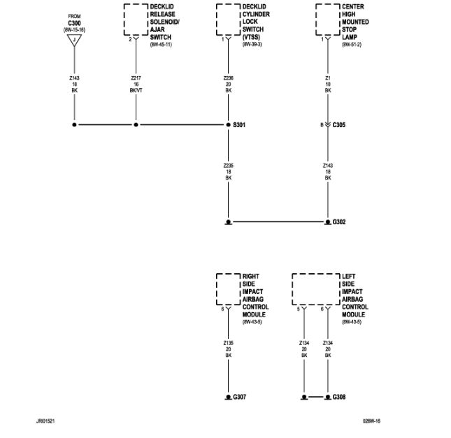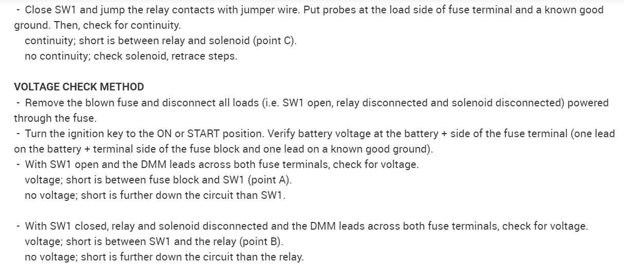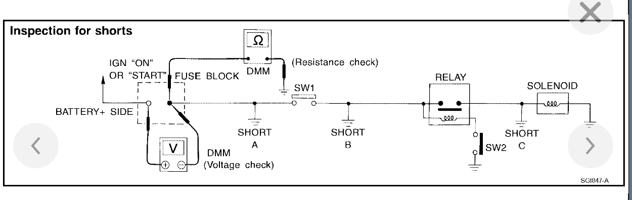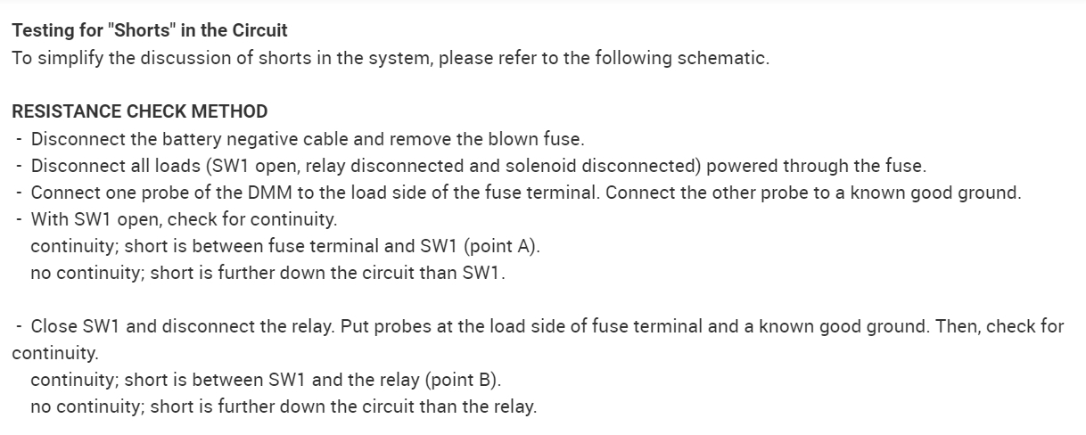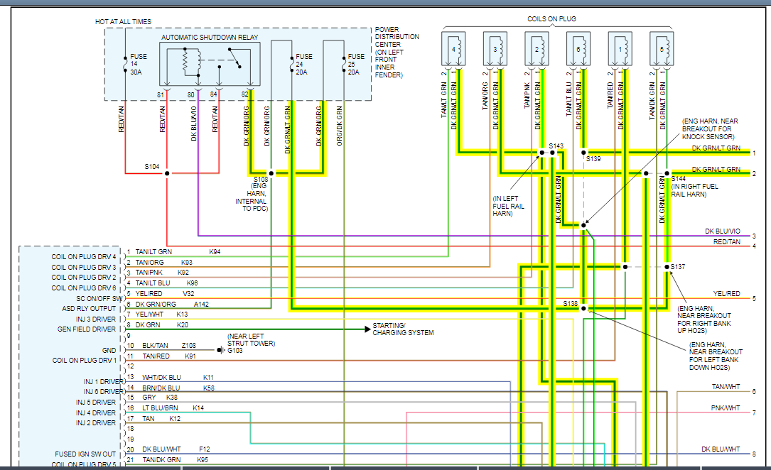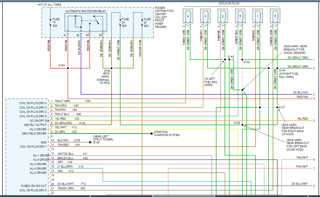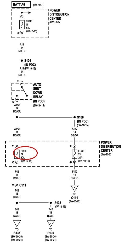 If you aren't sure if the short is something you caused, another way to find this is to replace the blowing fuse with a light bulb. That will limit current flow in the circuit to safe value, and give you a visual indication of when the short is present or removed. Normally I stick a 3057 brake light bulb in place of the fuse, but for anything related to the automatic shutdown, (ASD) relay, which this is, it's better to bypass the relay instead because that relay only gets turned on for one second when you turn on the ignition switch. Obviously that is not enough time to do any testing. The relay gets turned on again during engine rotation, (cranking or running), but since the engine doesn't run, any testing would have to be done while a helper is cranking the engine. Again, not practical.