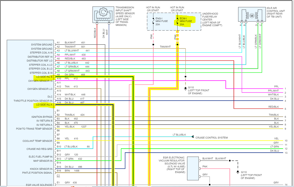 If they do, injector 1 has a dark blue wire that is the ground. The ground path is provided via the PCM. Injector 2 has a dark green wire that is the ground. Again, the ground path is via the PCM.