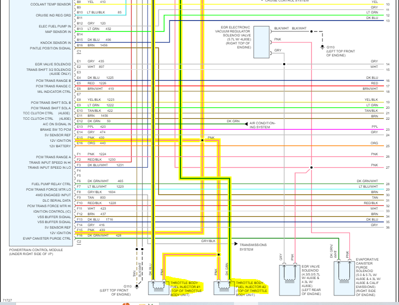 Each injector will have two wires. Both will have a pink wire. The pink wire is 12v power that is constant and present with the ignition key in the run position or start position. First, confirm both pink wires have 12v.