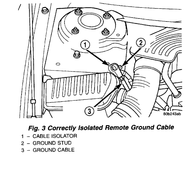 1. Remove the battery ground cable from the ground stud on the shock tower and isolate the ground cable by installing the cable isolator on the ground stud.