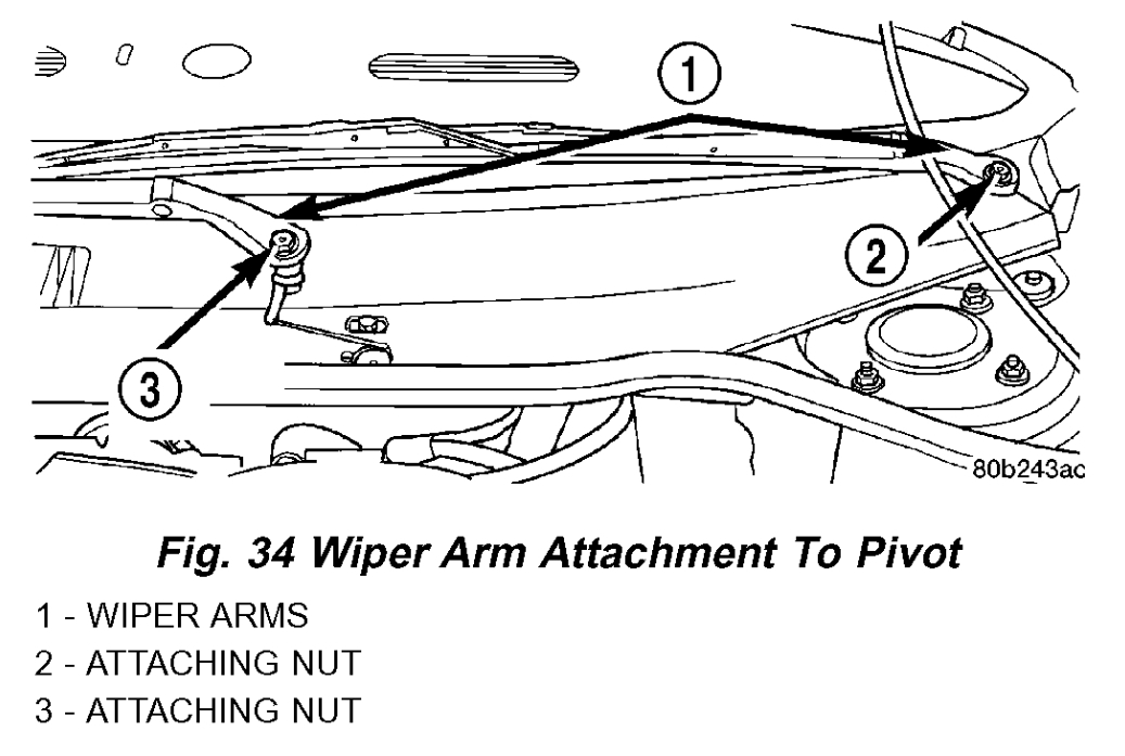 2. Remove caps from both wiper arms at the attachment to the pivots to expose the wiper arm attaching nut. Remove the nut attaching each wiper arm to its pivot.