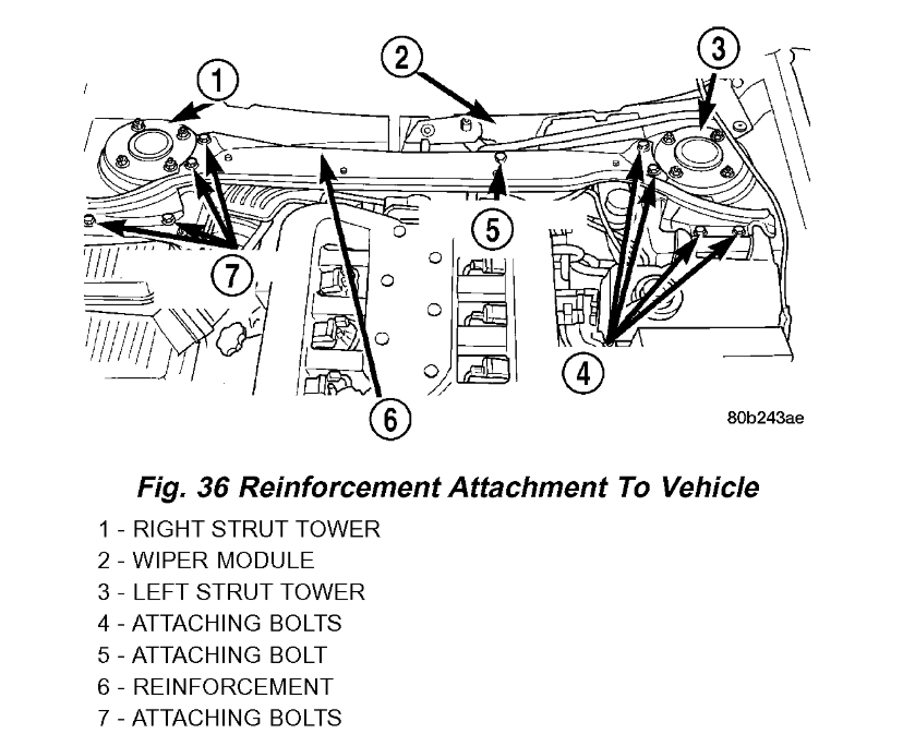 5. Remove the 8 bolts attaching the reinforcement to the strut towers and the 1 bolt attaching the wiper module to the reinforcement. Remove the reinforcement from the vehicle.