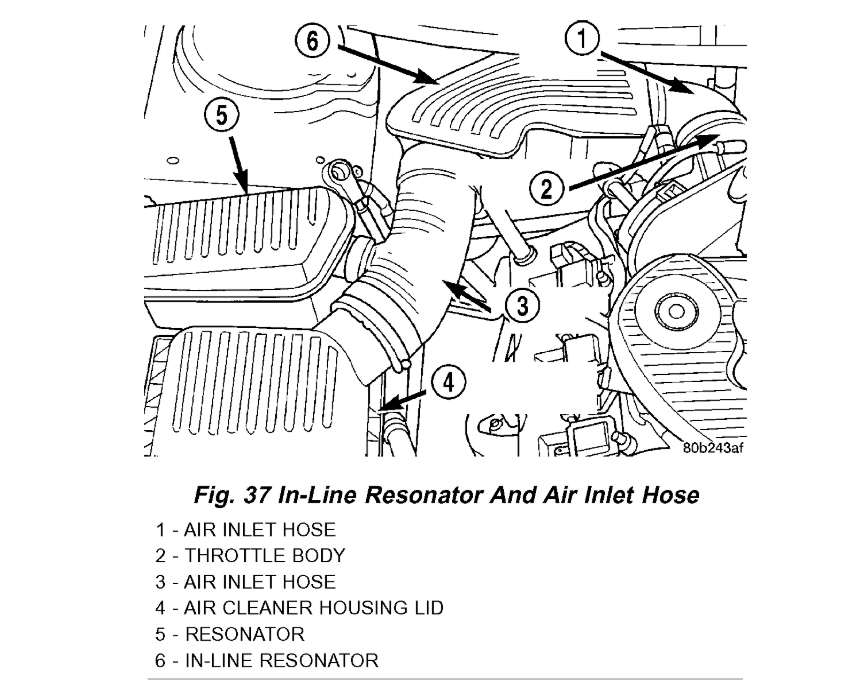 6. Remove the in-line resonator and inlet hose from the throttle body and air let hose coming from the lid of the air cleaner housing.