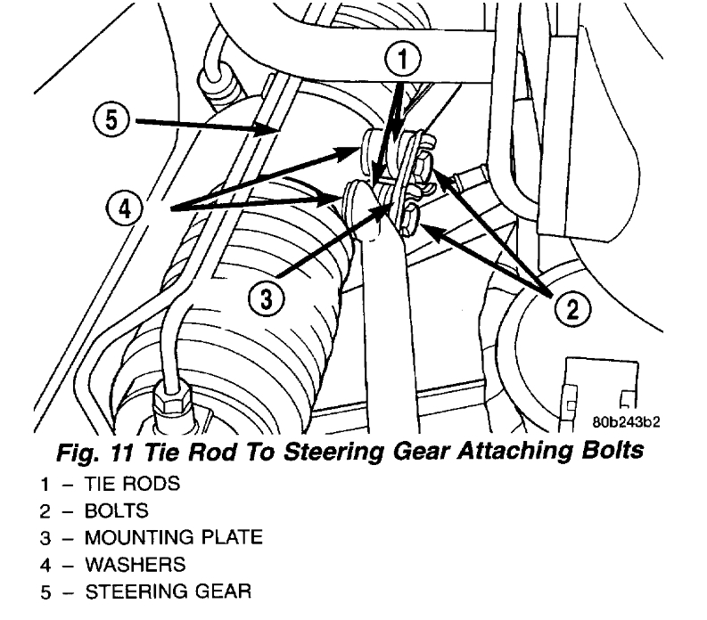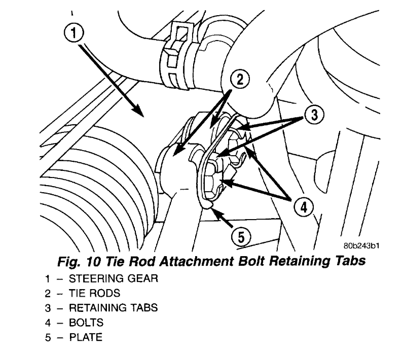 12. Bend back the retaining tabs on the mounting plate for the tie rod to steering gear mounting bolts.