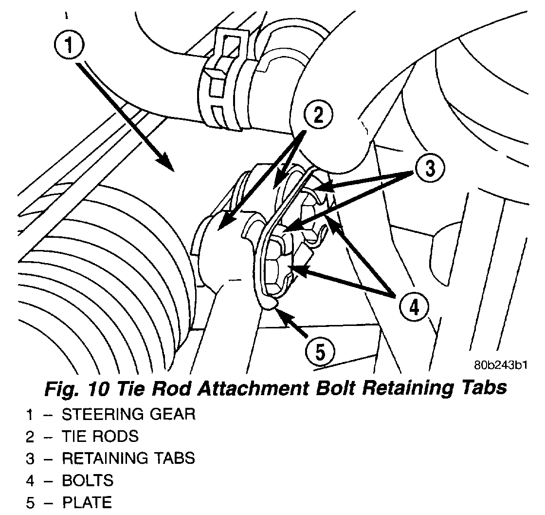 12. Bend back the retaining tabs on the mounting plate for the tie rod to steering gear mounting bolts.