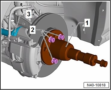 - Secure the Drive Shaft Remover (T10520) - 1 - with three wheel bolts - 2 - on the wheel hub, so that the drive axle - 3 - can be pressed out.