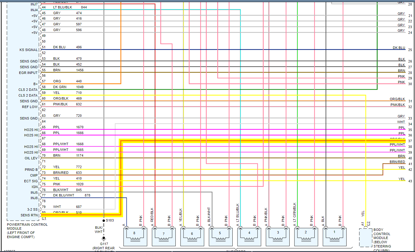 Okay, I sent another diagram for you. The 2 wires for the sender come from the ECM. I highlighted the wire. They are purple and orange/black. The purple is the sent voltage and the orange/black is the return. From there, it is sent by serial data line to the cluster.