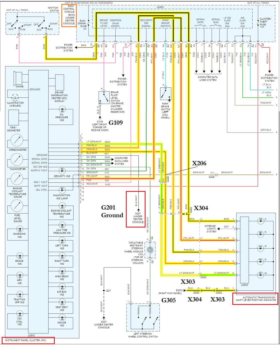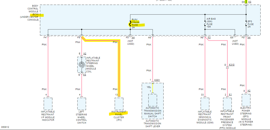 Something to take note of, if power is missing on the Pink wire to the Cluster, which comes from the Run/Crank Fuse 2AMP, which in turn comes from the IBCM (RUN/CRANK) Fuse 21 30AMP. This circuit also feeds the airbag module as well as the Automatic Transmission Shift Lever. This may account for the other codes if powers missing.