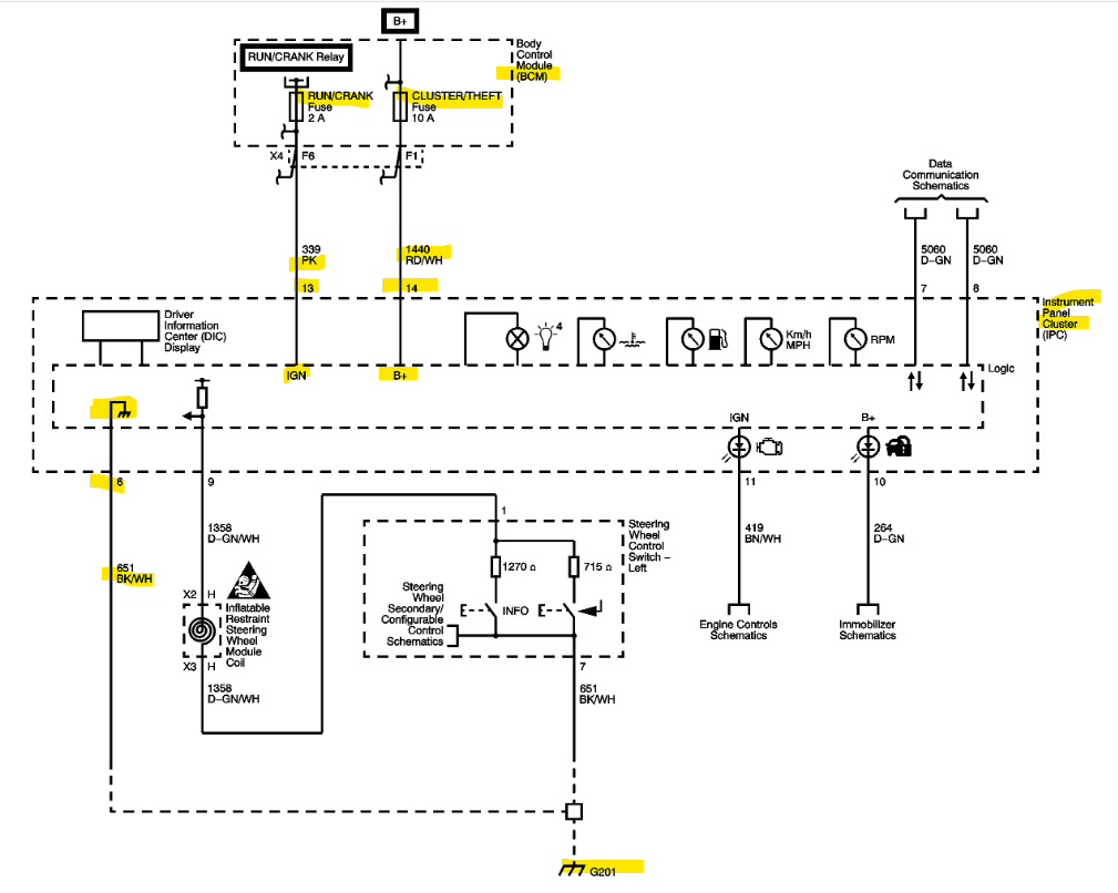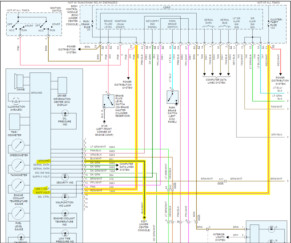 I would actually use the Clusters Ground for the test lights ground, taking care of 2 tests at once. So the Pink wire and the Red wire with a White stripe on it are the 2 power feeds at the back of the Cluster, and the Ground is Black with a White stripe, Ive high lighted them on the oem wiring diagram.