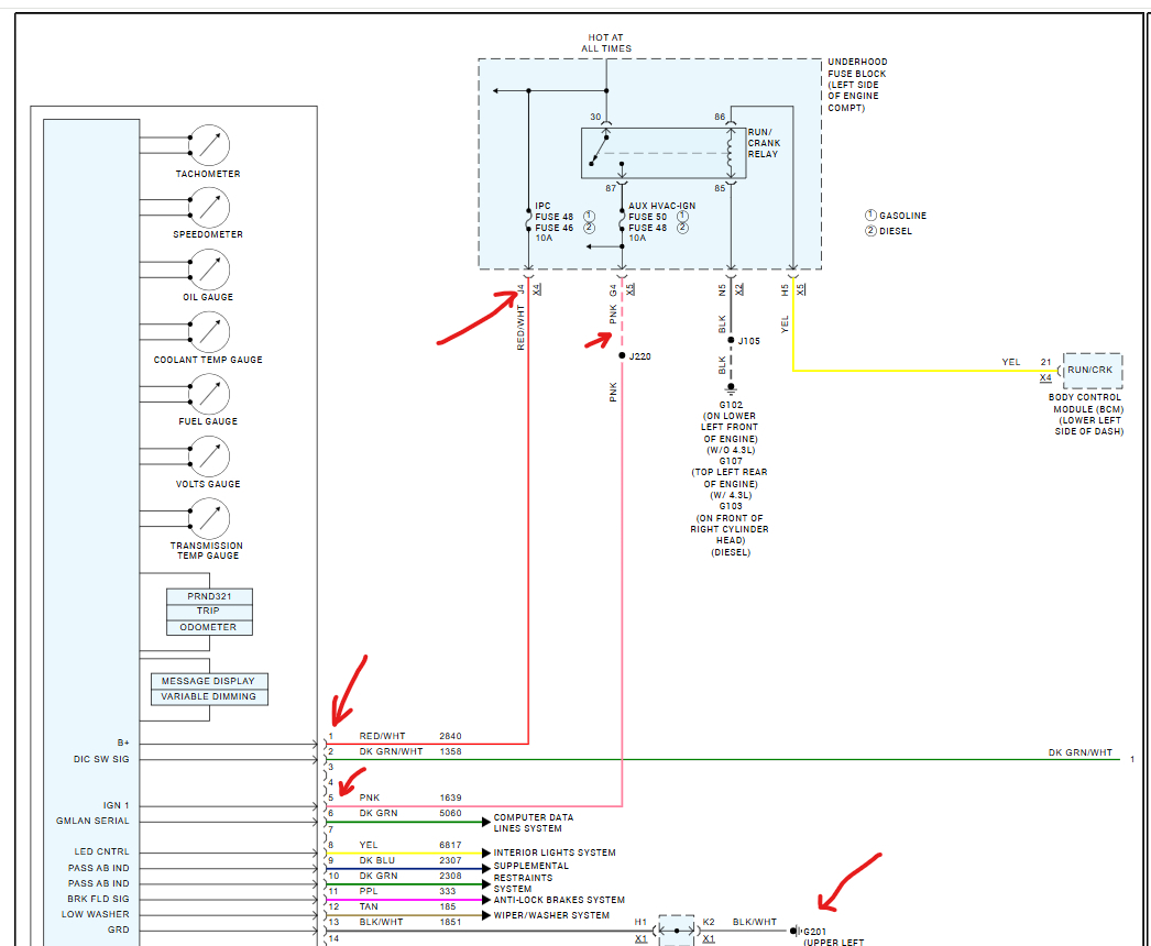 Sure, here are the power and ground locations for the instrument cluster which I have marked in red for you. Check out the images (below). Let us know if you need anything else.