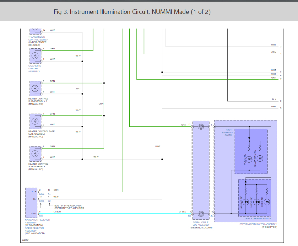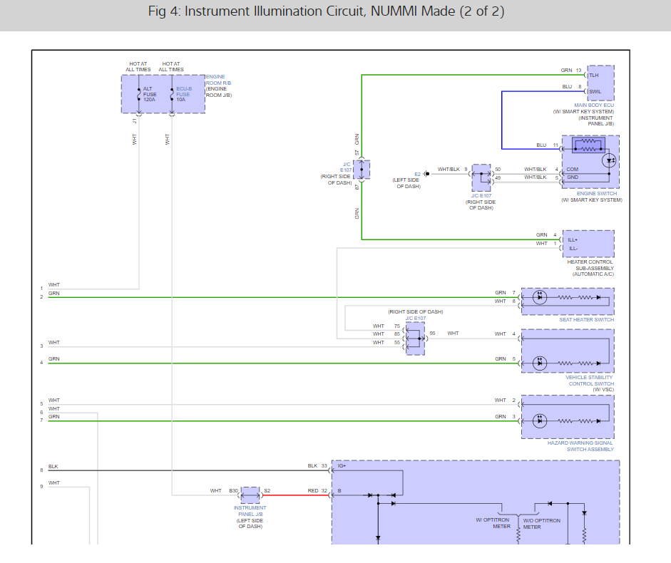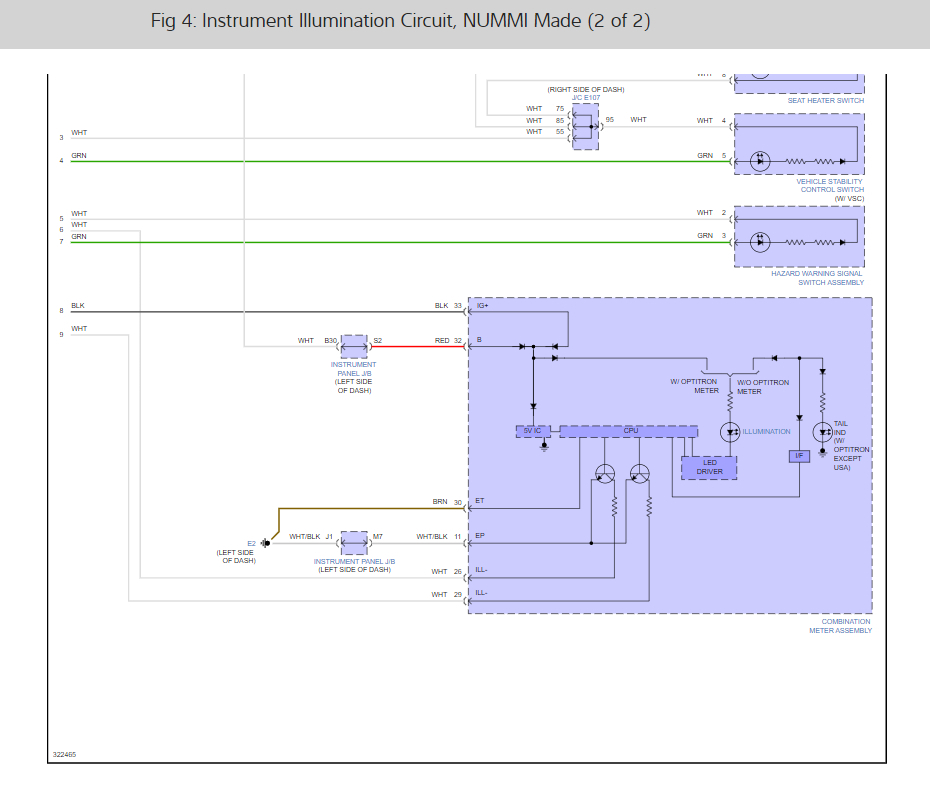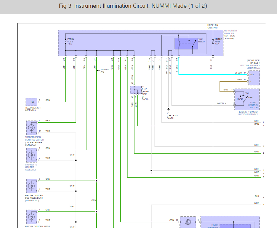 In the fuse panel on the left side of the dash we need to check the Panel and Meter fuse both are 7.5 amp. here is a guide to help and the fuse locations as well in the images below, I have also included the dash illumination wiring diagrams so you can see how the system works.