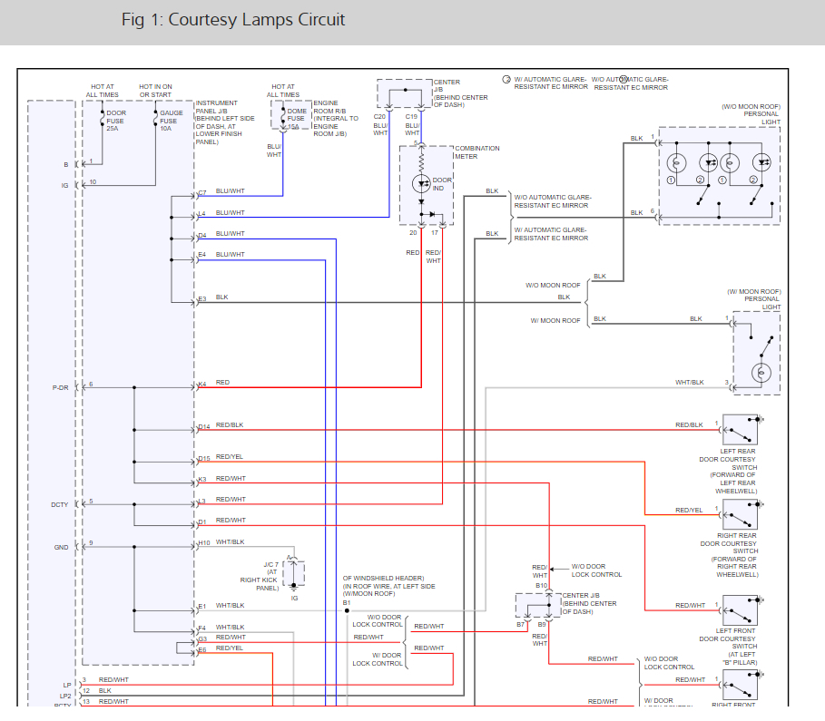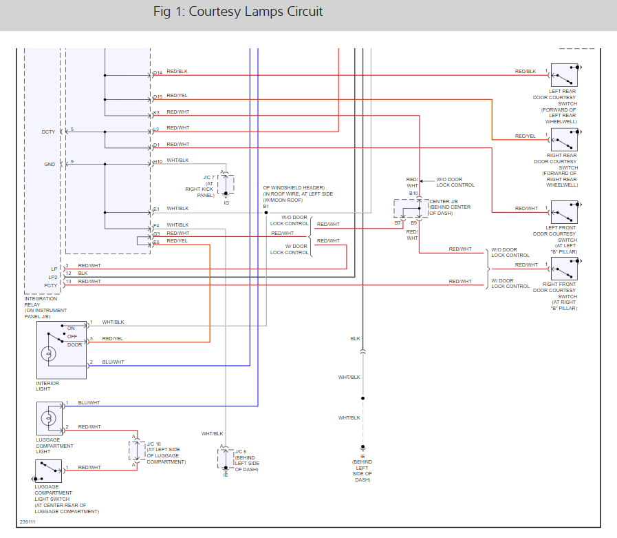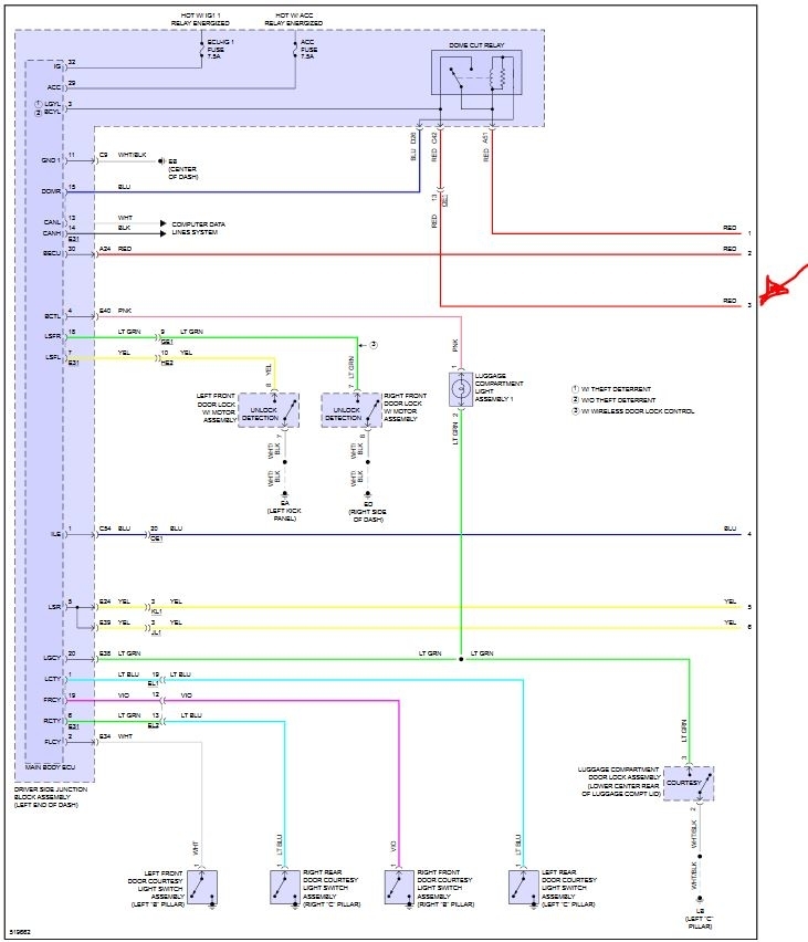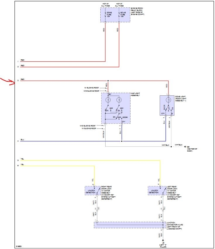 You will be looking for a red wire that comes from the dome cut relay. C42