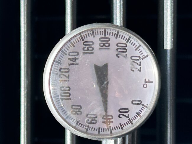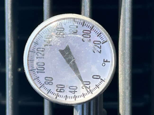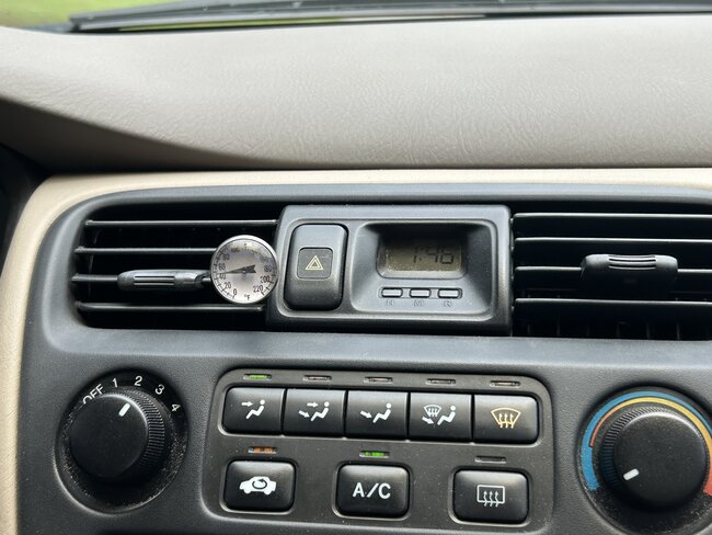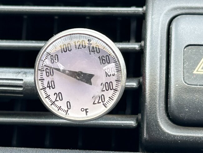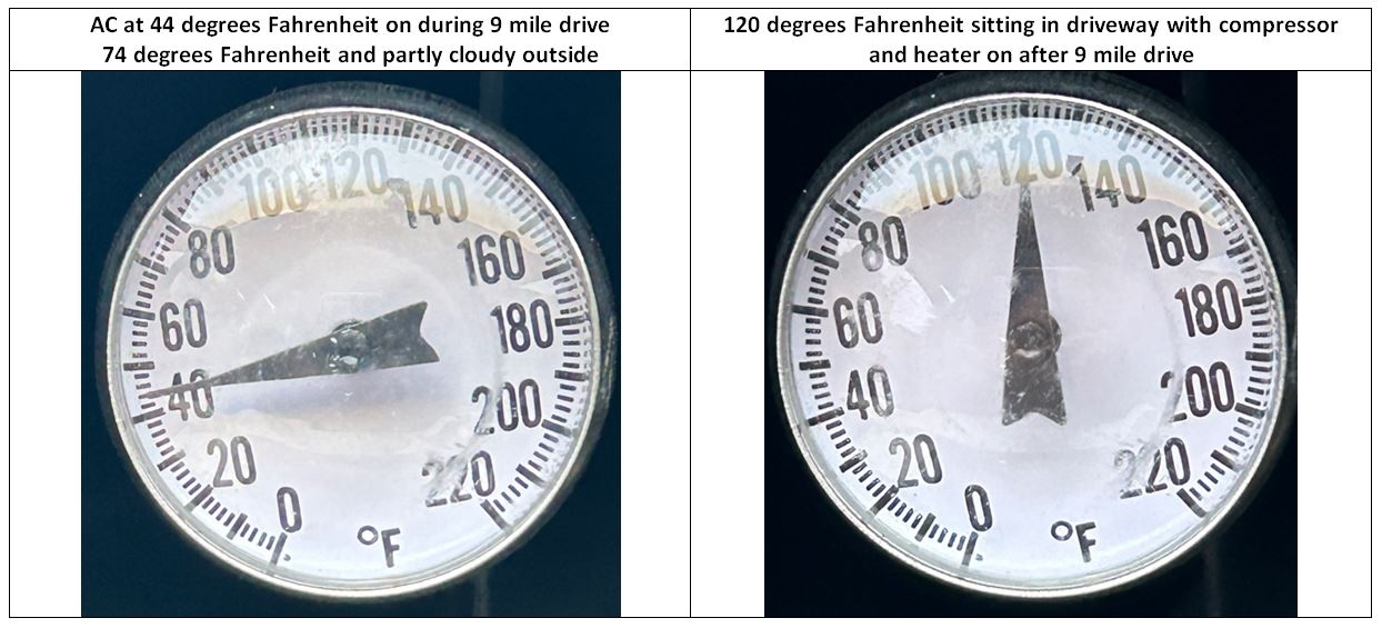 I tried checking things out when I got home. The A/C system worked with the car sitting in a driveway with outside temperature at 79 degrees Fahrenheit. The compressor clutch engages and the radiator fan on the driver’s side comes on when the A/C is turned on. An analog air vent thermometer measured as low as 66 degrees Fahrenheit, about 13 degrees cooler than outside air. I rotated the temperature knob from as cold as possible to as warm as possible, and two minutes later the thermometer was at 118 degrees. I rotated the knob all the way back to the cold side and after a few minutes the AC vent temperature was back at 66 degrees Fahrenheit. The car sat for an hour then I took it for a test drive. The A/C vent temperature is able to get down to about 47 degrees Fahrenheit while driving at 40 to 50 MPH. What I’ve said in this paragraph describes when the system is working.