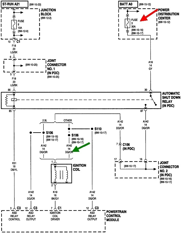 Chrysler Engine Computers turn on the automatic shutdown, (ASD) relay and the fuel pump relay for one second when the ignition switch is turned on, then again when it sees engine rotation. It knows the engine is rotating by the signal pulses it receives from the crankshaft position sensor and the camshaft position sensor. The ASD relay switches on the 12 volts to the ignition coil(s), injectors, oxygen sensor heaters, alternator field, and in some cases, the fuel pump relay. On other models it just switches the fuel pump relay directly at the same time it turns the ASD relay on.