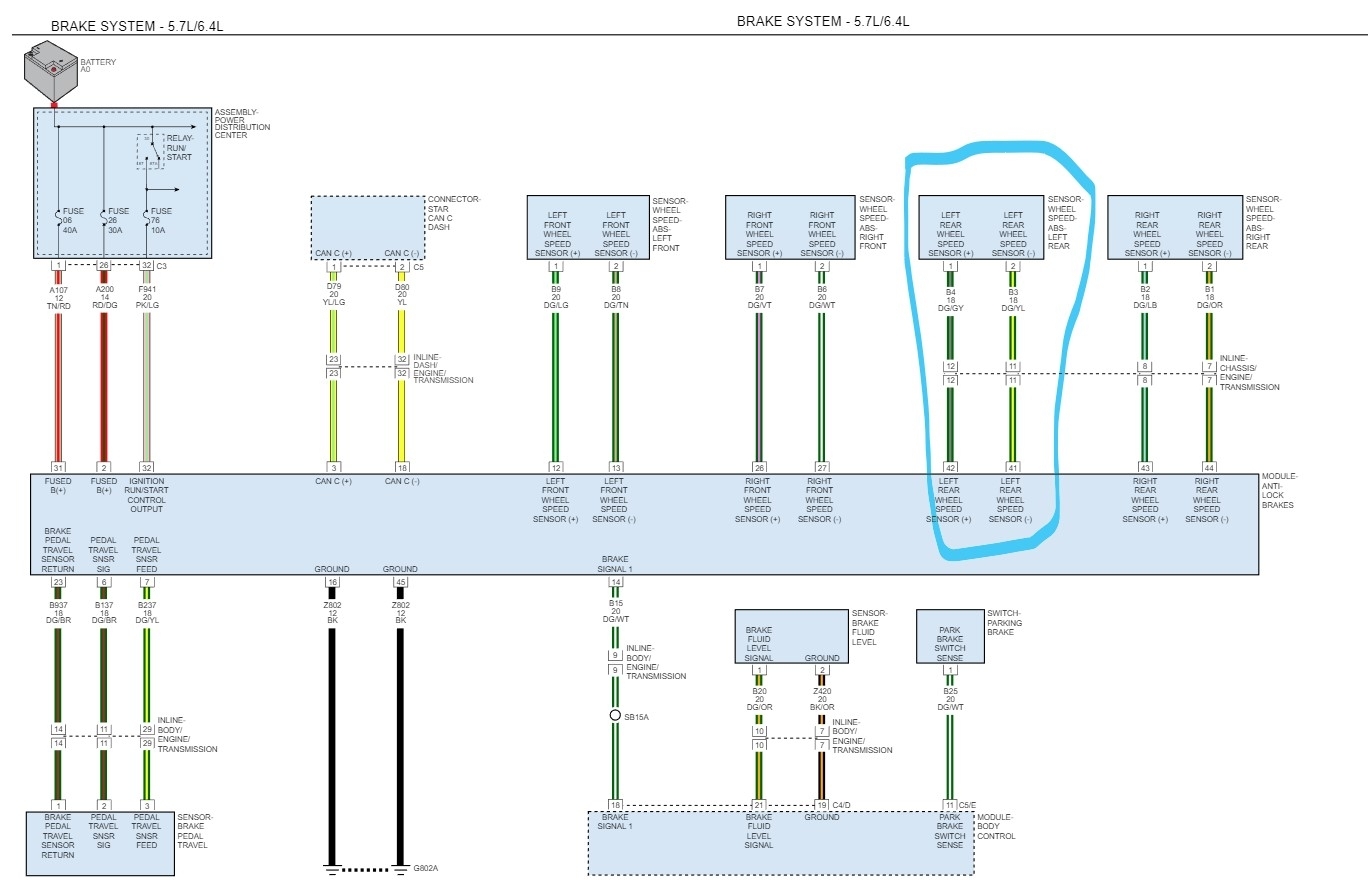 So, I had the dealer check the original Mopar sensor thinking if it worked well then, the original intermittent signal was not from the sensor. They told me the original sensor didn't give signal and as such didn't work. So, I was back to wondering which repair to perform. I decided to replace the ABS module and HCU. My buddy and I could do this and see what happens. I bought the parts yesterday and a scanner from AutoZone that could bleed the ABS. I drove 1.5 hours to my buddy's shop, and we got started. Now, he is a heavy equipment mechanic working on dozers, skidders, loaders, etc., mainly John Deere. We decided to start over, and he called his Snap-On rep who used to be a Mopar mechanic. He told us the problem was the line rubs through somewhere and to run a new line. It is a twisted pair, and my buddy should know how to do this secondary to his experience with John Deere. We decided to check the line to confirm. We put the reader on it and line 41 showed 3.7 ohms/milliohms and line 42 showed 25. My buddy laughed at all the trouble I've had for 3 months. Now, to back up, this confirms what my neighbor and I found early in the process when we couldn't get continuity on line 42 but could on 41. We got confused when we broke the line at the 12-pin connector and had good continuity on each segment of line when they were broken at the connector. So, my buddy twisted a new run, and we spliced it in. All dash lights off. I drove the truck the 1.5 hours home, hitting holes and sparing no speed/line to ensure the truck bounced around. I had no problems. I ran the cruise control, in and out of 4wd and 4 low. Today I went to our favorite swimming hole down a rough logging road and had no problems. Had to use 4wd even. So, a new line seems to have fixed it.