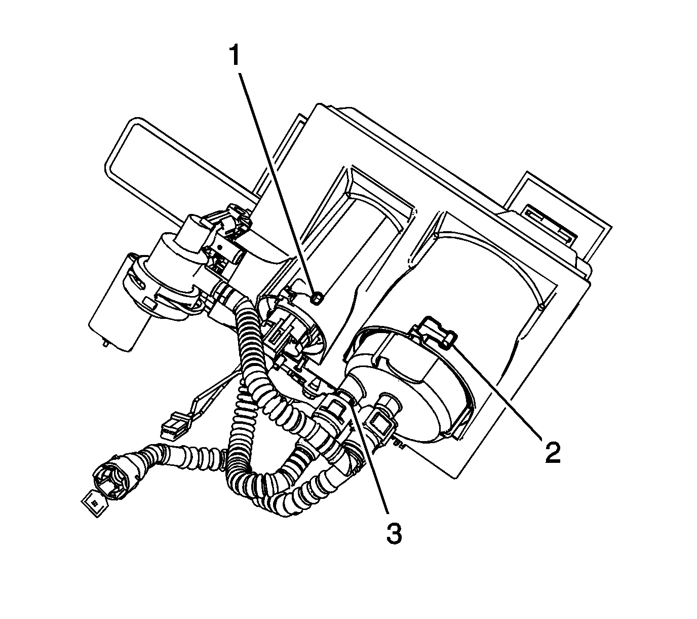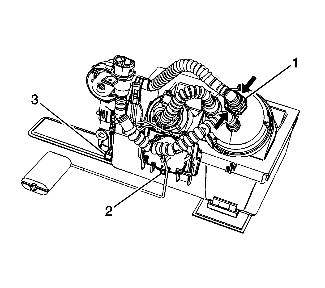 8. Squeeze the sides of the fuel pump fuel reservoir pump fuel strainer quick connect fitting together (1) in order to remove the fitting from the fuel filter. Refer to Quick Connect Fitting Service - Plastic Collar.