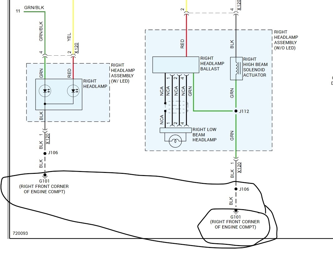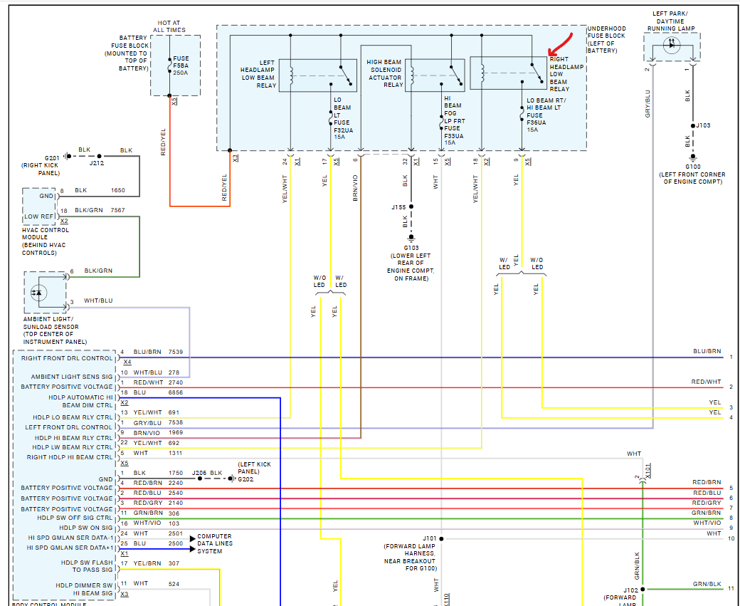 The right headlight is run by the BCM which turns on a relay, I would check the ground of the headlight as well. Here is the wiring diagrams as requested. It shows the control relay at the fuse panel under the hood. Check out the images (below). Please let us know what happens.