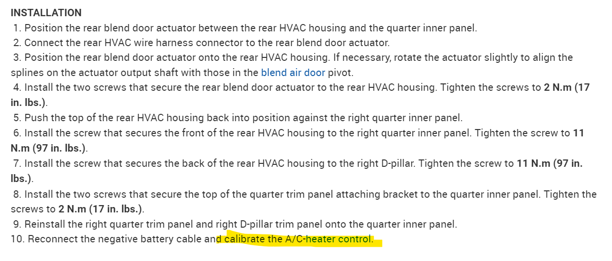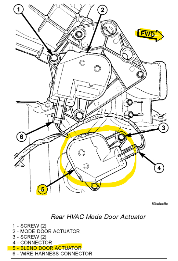 But this might actually be a wiring issue too, it saying here that the Front Blend door actuator is connected to the rear blend door actuator, so they move together when switching from hot to cold. I'll see if I can find where these wires run and maybe it will end up being a broken wire. Although the Blend doors do need to be calibrated, there might be a diagnostic trouble code stored in the HVAC control module if an issue is detected. In this case there should be a code stored. But you will need a scan tool that can scan the entire vehicle systems and not just the engine computer. I will post further information.