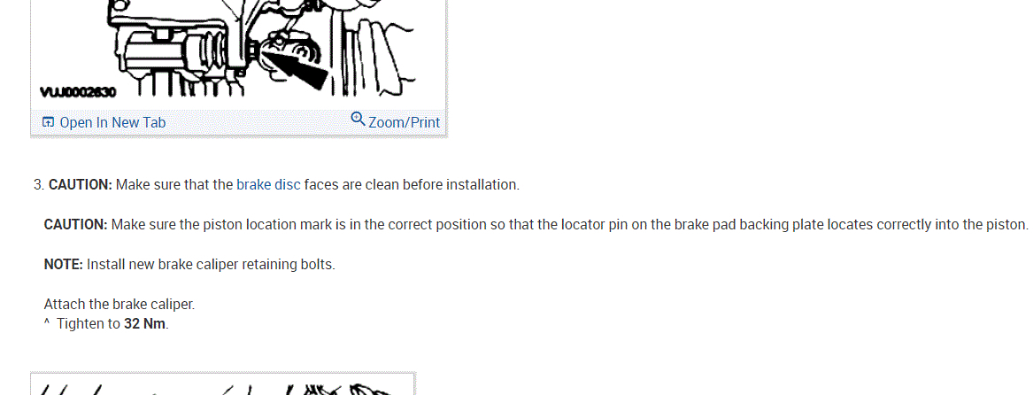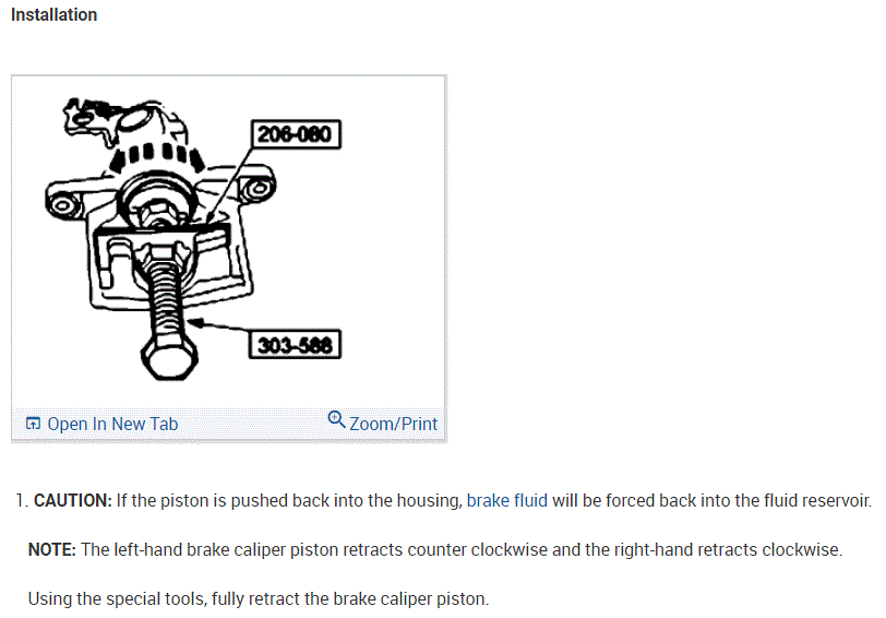 CAUTION:Retracting the caliper piston may cause the fluid reservoir to overflow. Remove brake fluid spillage immediately from paint work with clean water.