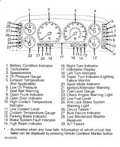 Twenty-two warning lights are arranged in 4 groups on the panel. There are 7 lights each at left and right sides of instrument panel and 4 lights on each side of odometer at bottom of panel.