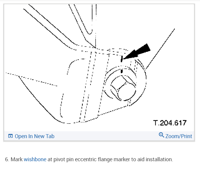 Mark the wishbone at the pivot pin eccentric flange marker to aid installation.