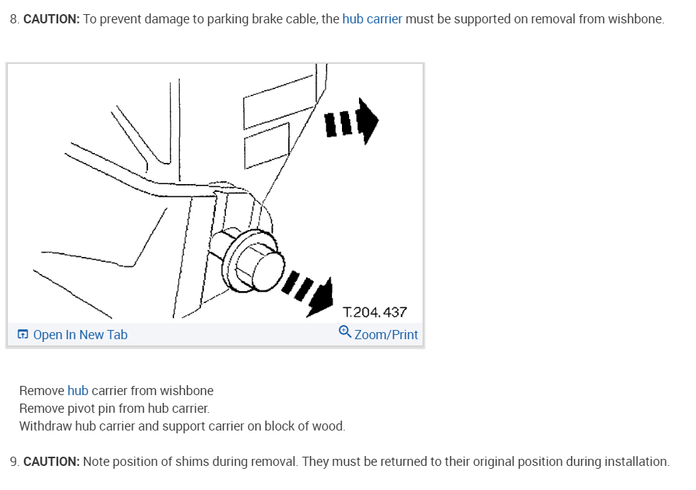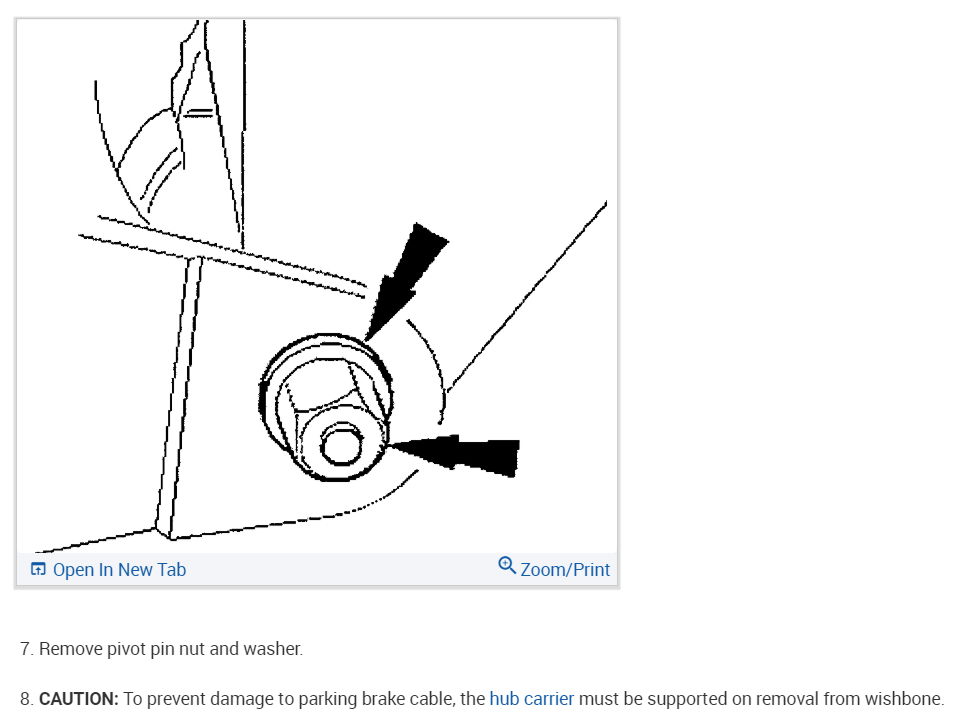 CAUTION:To prevent damage to the parking brake cable, the hub carrier must be supported on removal from the wishbone.