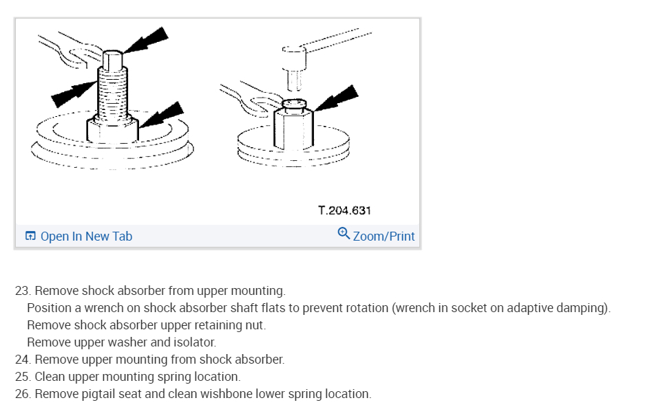 Position a wrench on the shock absorber shaft flats to prevent rotation (wrench in socket on vehicles with adaptive damping).