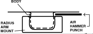 Remove radius arm from mount with an air hammer with a 3/8" flat punch, or equivalent. Direct punch straight in against body part of mount.