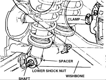Lift wishbone assembly and refit lower shock mounting shaft and spacers.