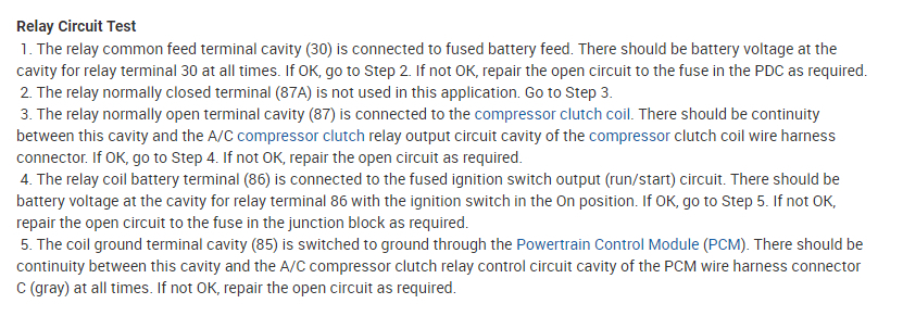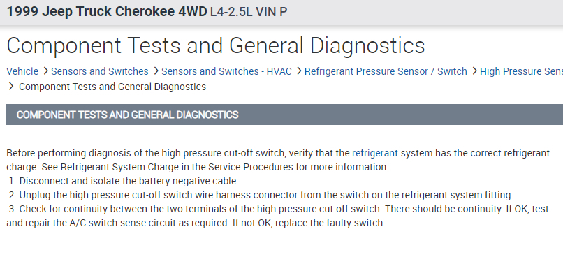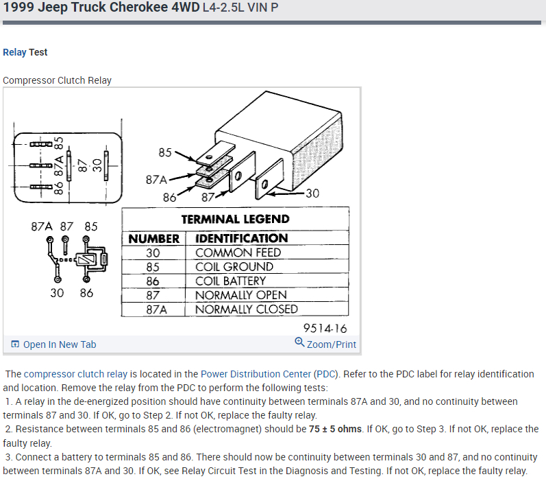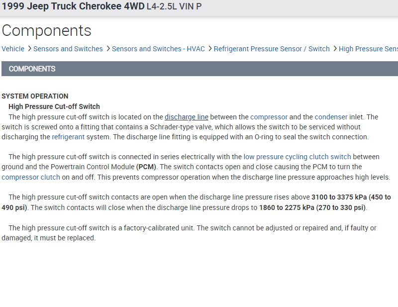 Good Day, This a/c problem is related to a recently purchased 99 Jeep Cherokee w/ 131000 miles. I noticed that when I start the a/c it continually cycled on and off. I looked under the hood and saw that the clutch, I think it is called, is what is cycling at what seems to be regular intervals and consequently the interior of the car never cools down, it not to long ago did work. I listened closely and could hear the related relay click, I assume it closes just prior to the clutch starting the cycle sequence. That led me to think that perhaps the relay is not functioning properly. I was wrong and I found that the new relay has the same resistance across the coil (75+ ohms) as the original one. At this point I need to recharge the system. Thank you