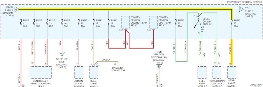 According to the schematic, it comes from fuse 2 of the junction box. However, take a look at the picture. If there was not power from fuse 2 (40 amp) many other things would not work. I highlighted the supply. I have a feeling the box itself has failed or melted internally for fuse 23. Take a look at the pic and let me know your thoughts. You may have to disconnect the battery and remove this fuse box to inspect it from the underside.