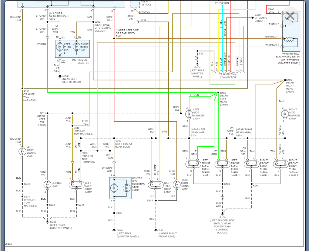 You will see in the wiring diagram below where the tail lamps are fed from the switch. So, we need to find out if the rear lamps are being commanded on. If the voltage is coming out of the switch, then we more than likely have a wiring issue before we get to the splice in the rear of the vehicle.