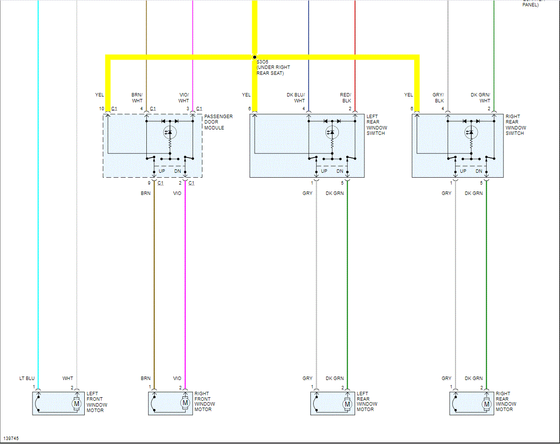 I highlighted the wire I'm referring to below. That supplies power to each of the other window switches and motors. Note that I had to cut the schematic in half to make it readable for you. However, I did overlap them so you can follow from one to the next.