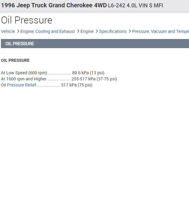 This vehicle should have 13 PSI of oil pressure at idle and 37-75 PSI when the engine speed is at or above 1,600 RPMs.