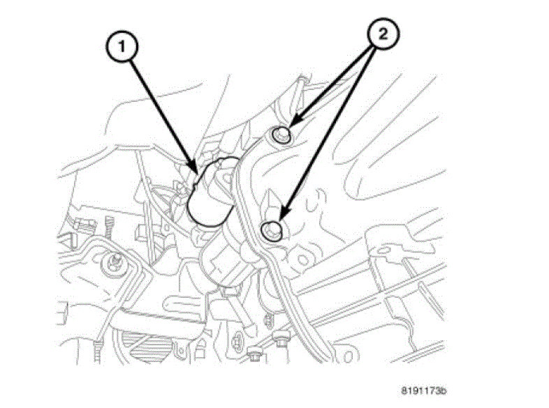 3. While supporting starter motor (1), remove two bolts (2) securing starter motor to transmission.